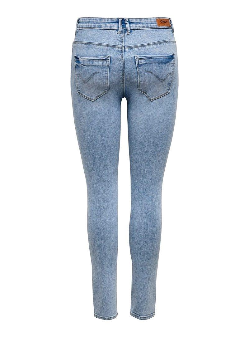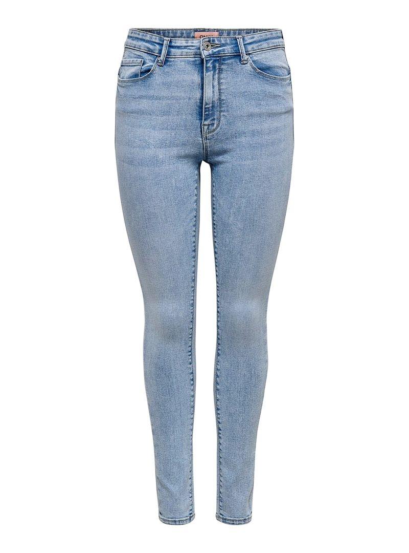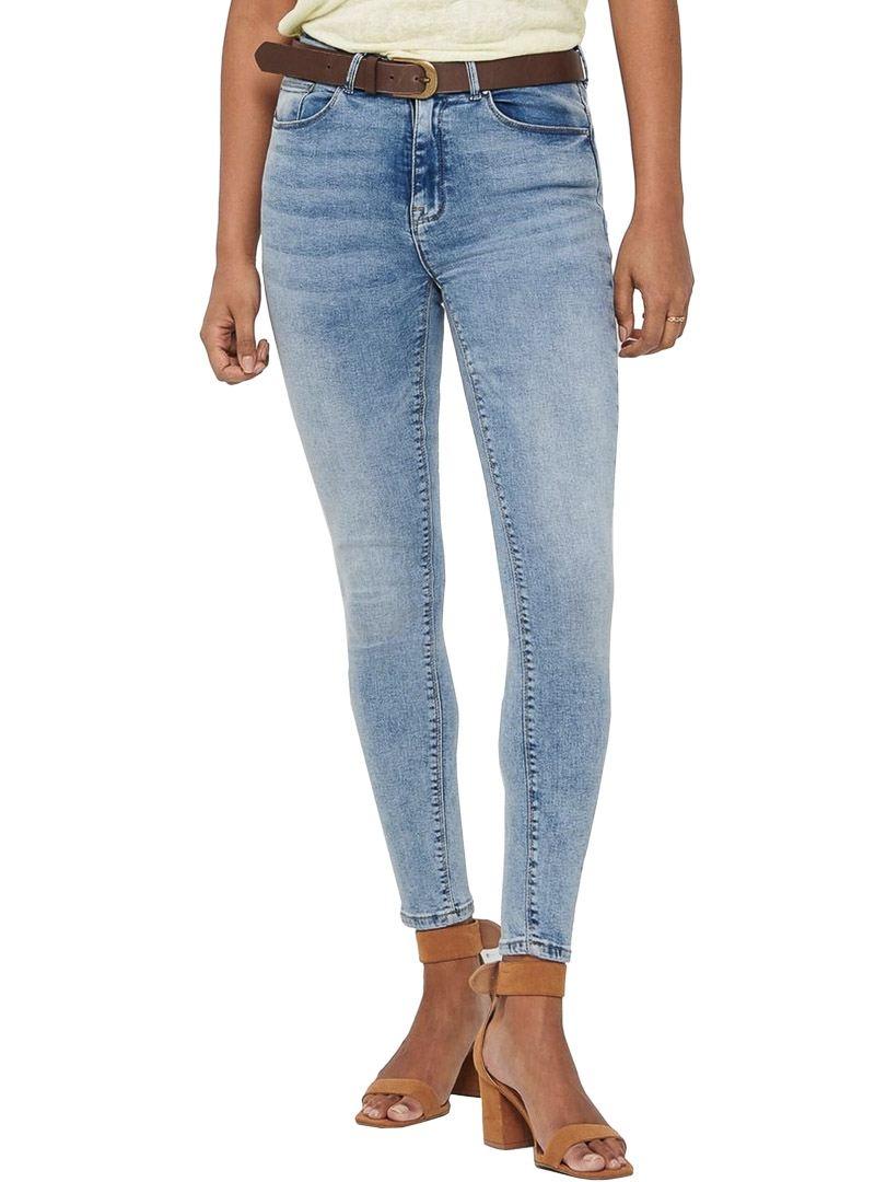 Jeans Only. Modelo Paola. Tom de luz denim. Cintura alta. Skinny con tornozelo longo. 5 bolsos. Fecho na frente con botão e zíper. A modelo está usando tamanho S.