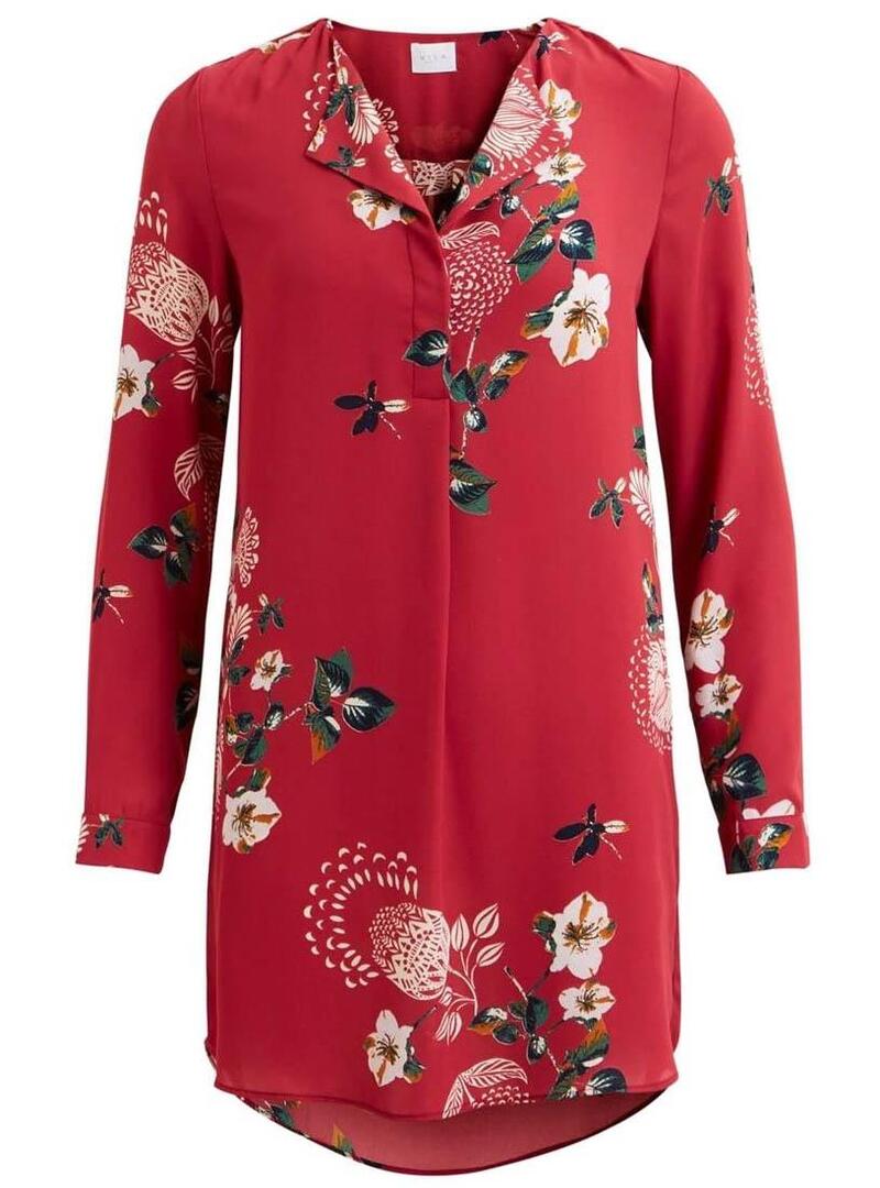 Tunic Vila. Modelo de Vilucy. Cor granada. Estampa floral. Manga comprida. Colarinho com botões. Regular fit