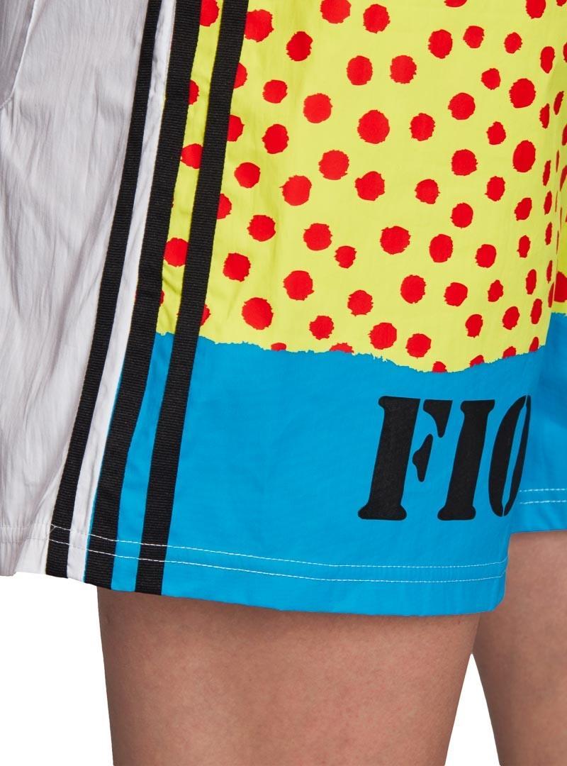 Short Adidas. Modelo Graphic. Cor amarelo. Estampado do moles na frente. Fundo em azul. Dorso branco. Bandas nas laterais. Bolso traseiro.