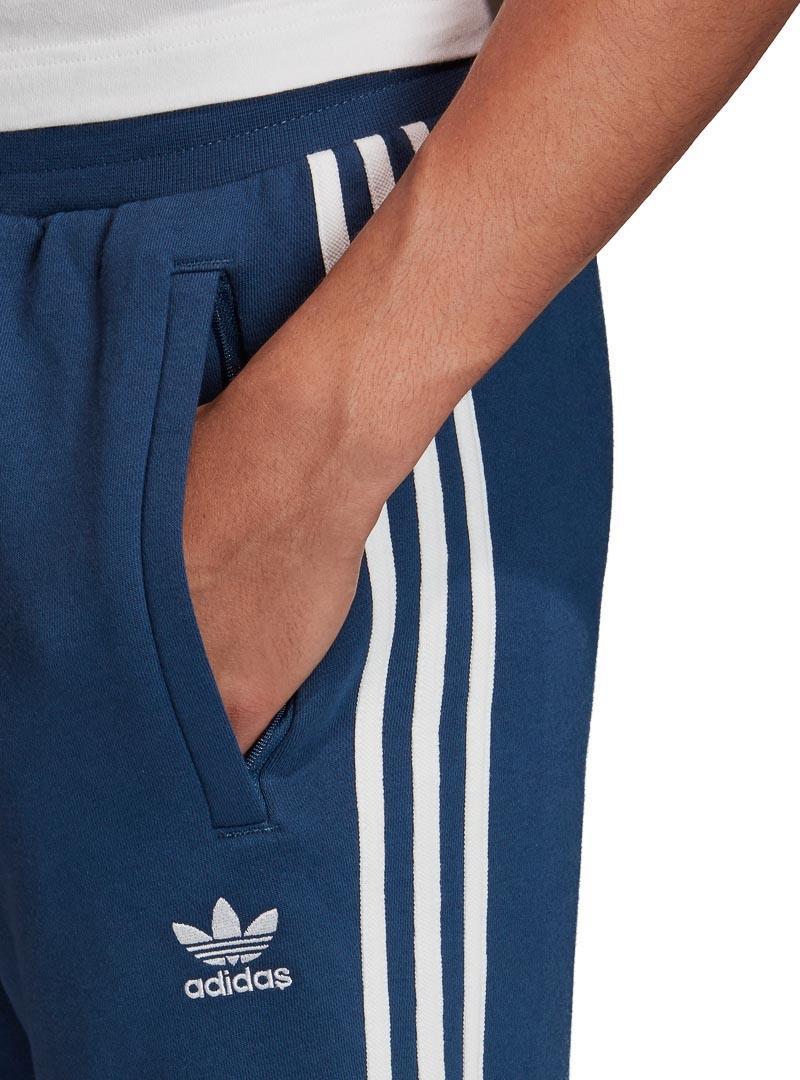 Calças Adidas. Modelo 3 Stripes. Cor azul. 2 bolsos laterais con zíper. Logotipo da marca em uma perna. Bandas nas laterais. Slim fit. A modelo está usando tamanho M.