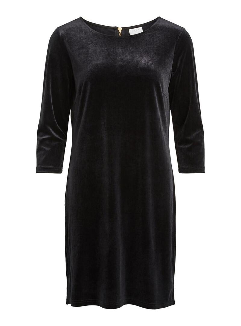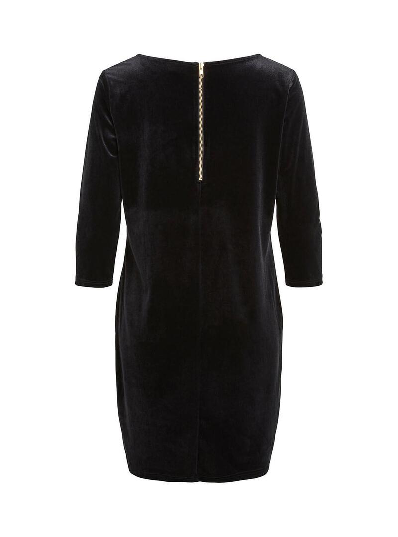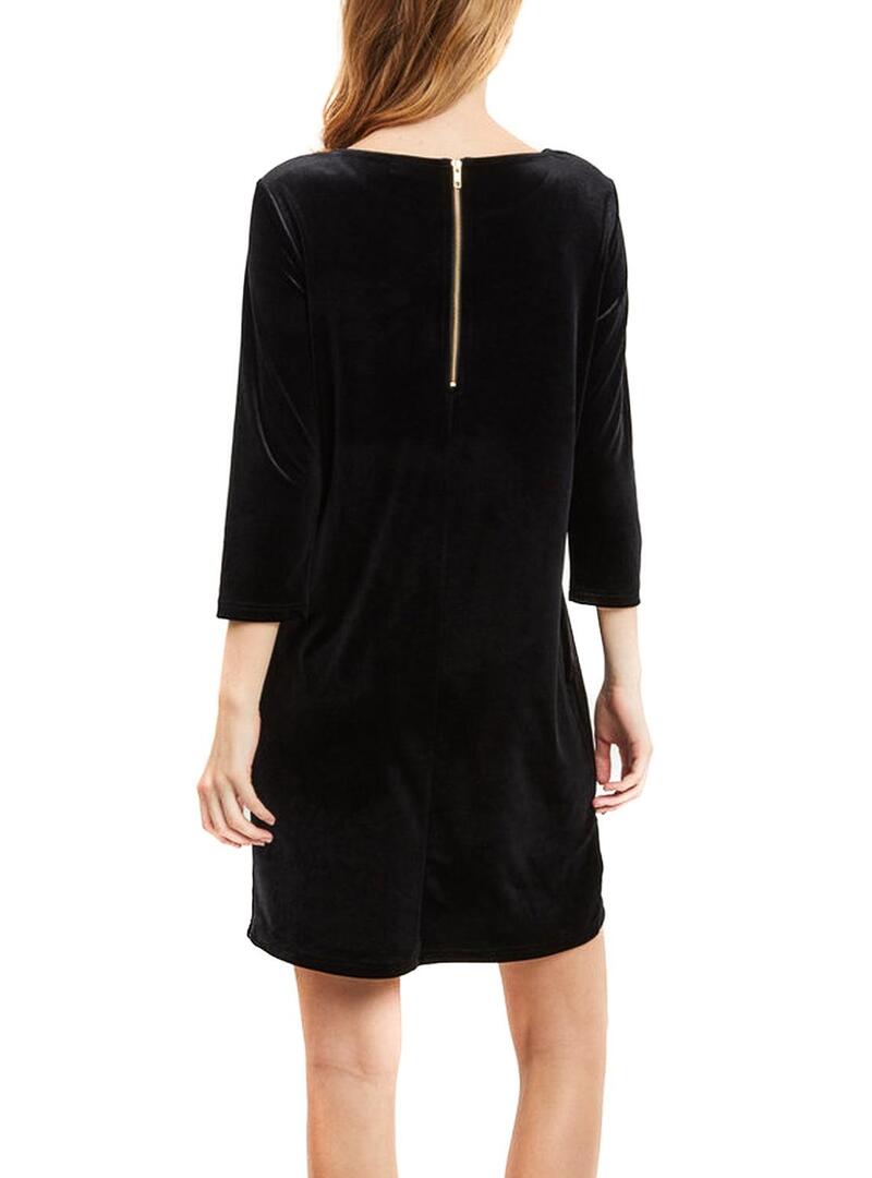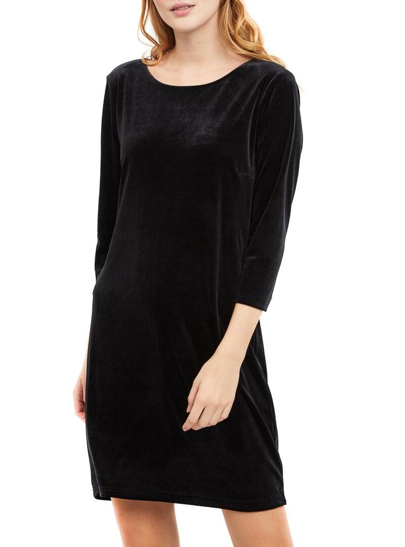 Vestido da vila Modelo Viminny. Cor preta. Manga 3/4. Pescoço redondo. Fecho de correr nas costas. O modelo usa tamanho M.
