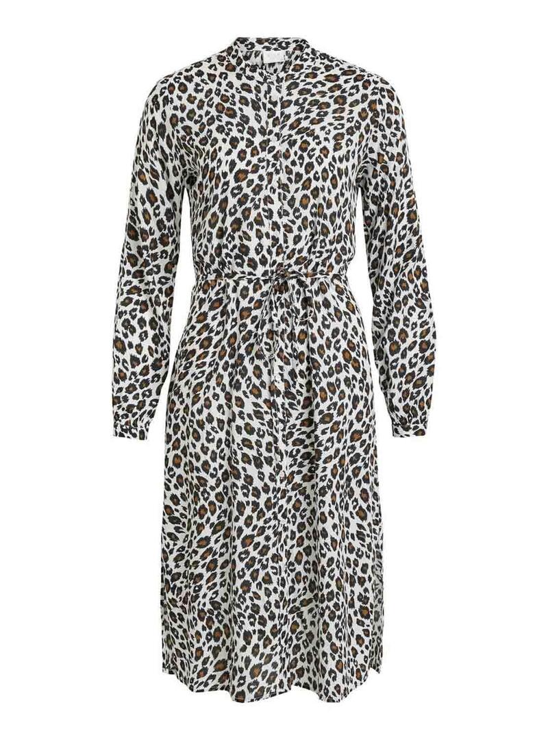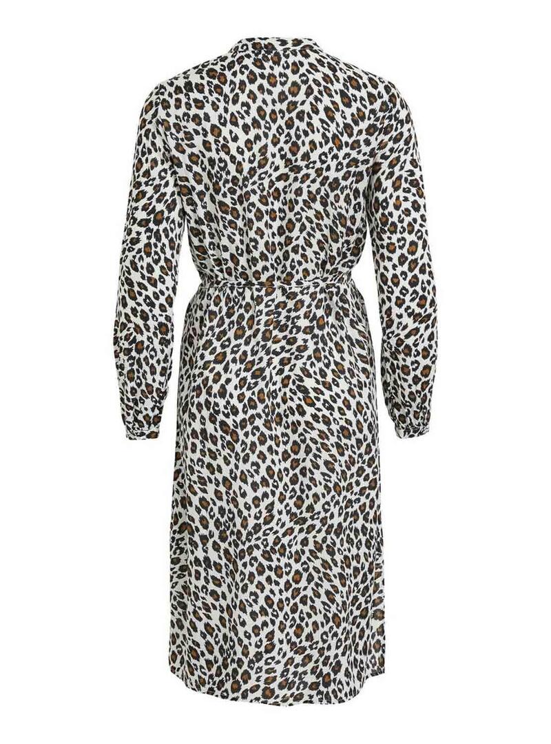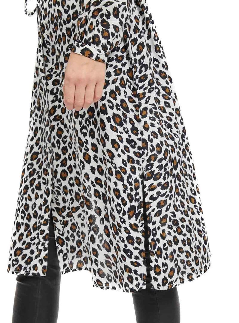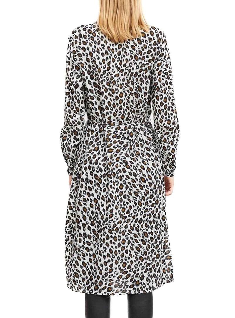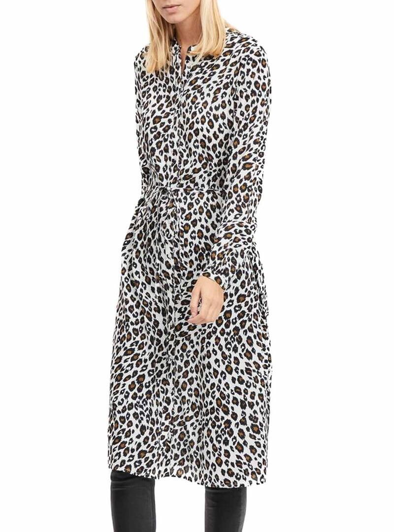 Vestido da vila Modelo de Vikamia. Cor branca. Mulheres. Manga comprida. Pescoço v. Cinto destacável. Fechar com botões. O modelo está usando tamanho 38.