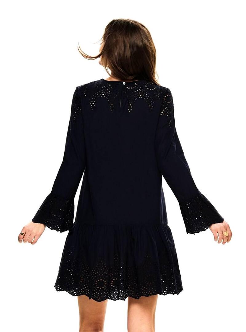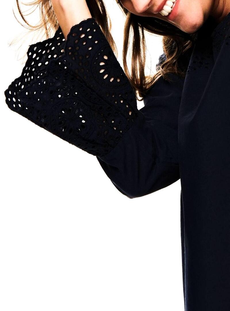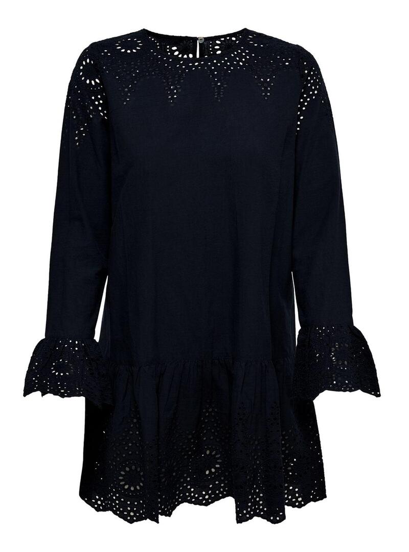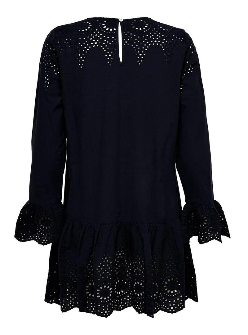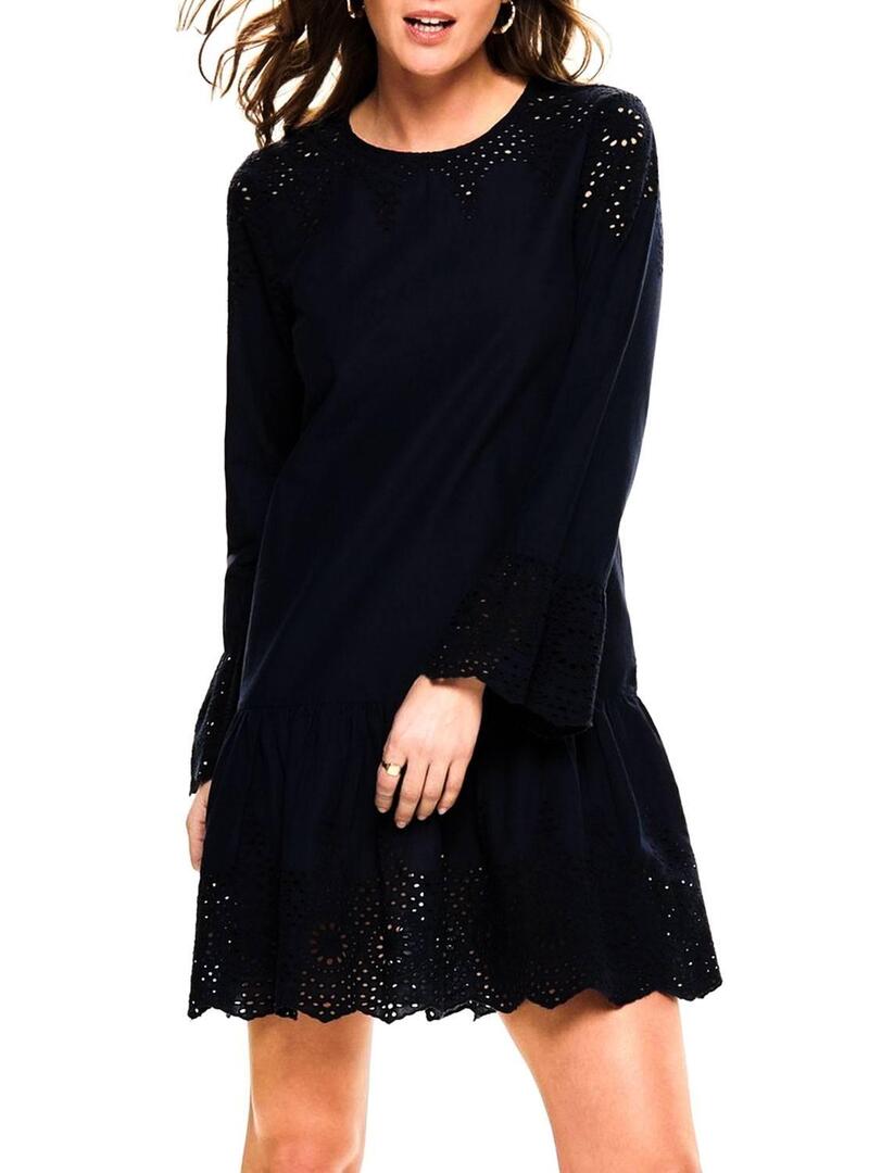 Only vestido. Modelo Alberthe. Cor marinha. Manga comprida. Pescoço redondo. Detalhes bordados. Fechamento do botão de volta.