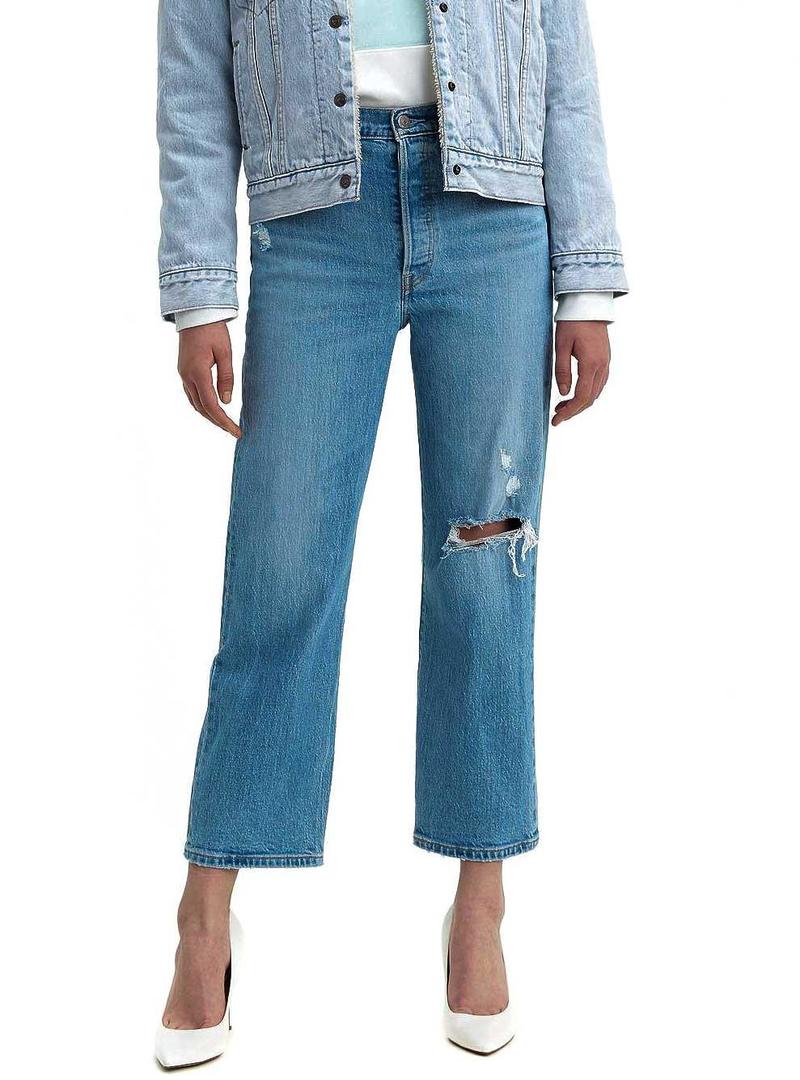 Jeans Levis. Modelo Caixa torácica. Jeans médio. Cintura alta. Ajuste solto. Longo pelo tornozelo. Estilo Coulotte. Cinco bolsos Efeito Desgastado Quebrado no joelho.